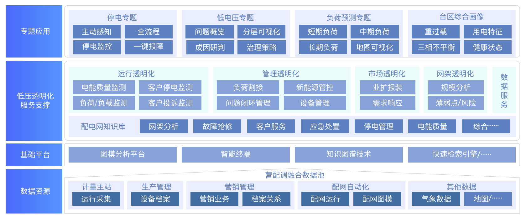 ÊµÏÖÓªÏú¡¢ÅäÍø×Ô¶¯»¯¡¢¼ÆÁ¿×Ô¶¯»¯¡¢µ÷¶È×Ô¶¯»¯µÈÖ÷ÌâÒµÎñÊý¾ÝÒÔ¼°ÓйØÐÎÏóµÈÓÐ¹Ø±í²¿Êý¾ÝµÄÒ»Ì廯ÈÚºÏÓ뼯ÖУ¬¹¹½¨Í³Ò»Êý¾Ý×ÊÔ´³ØÎªµÍѹÅäµçÍøÍ¨Ã÷»¯ÖÎÀíÓëÖ´ÐÐÌṩÓÐÁ¦µÄ»ù´¡Êý¾ÝÖ§³Ö  ¡£