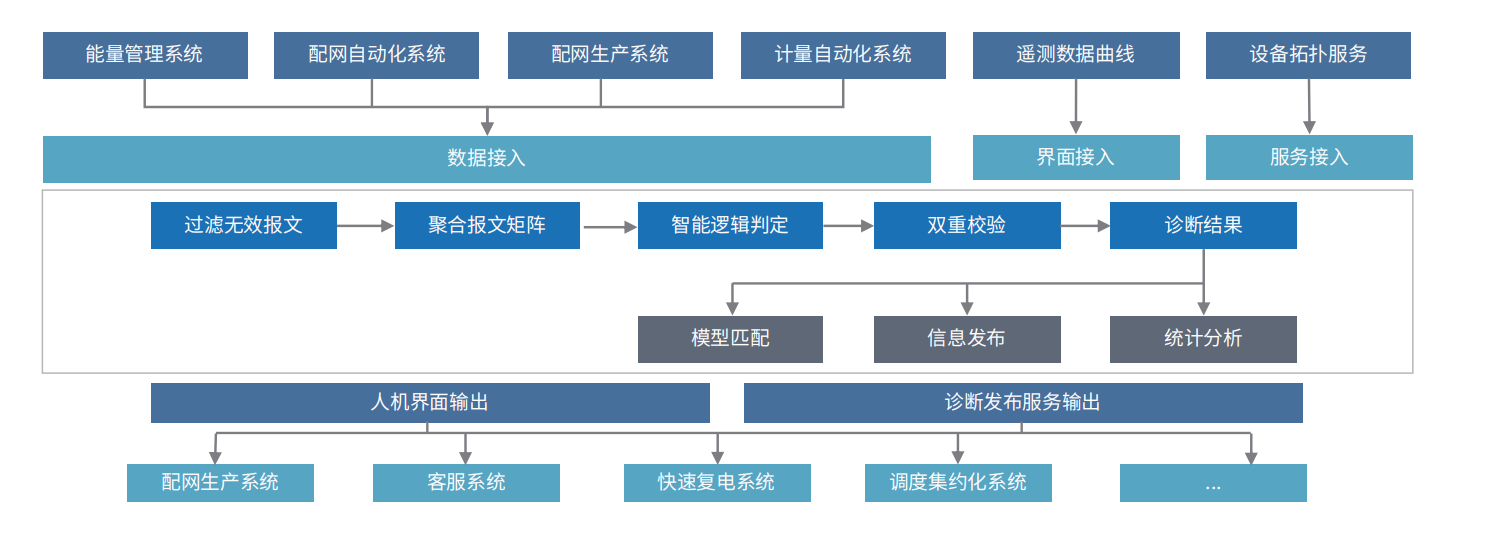 ÀûÓÃÖÇÄܸÐÖª¡¢Êý¾ÝÍÚ¾òµÈ¼¼Êõ,ͨ¹ýµ÷¶ÈÒ£²â¡¢Ò£Ðż°µçÍøÍØÆËÐÅÏ¢,»ùÓÚר¼Ò¾­ÑéµÄ¹ÊÕÏÖÇÄÜÕï¶Ï¼¼ÊõʵÏÖ¹ÊÕÏÓòÇøÓòµÄÅж¨,¶øºóÀûÓöàÔ´Êý¾Ý»ùÓÚ´óÊý¾Ý·ÖÎöʵÏÖ¹ÊÕ϶¨Î»¸¨Öú,½áºÏÉ豸½¡È«×´Ì¬ÐÅÏ¢¡¢µÍѹÖÇÄܵç±íÊý¾Ý¡¢¹âè´øµçÐÅÏ¢¼°»°ÎñÍ£µç±¨ÕϵȶàÖÖÐÅÏ¢×ÛºÏÅжÏÍ£µçµØÎ»ºÍÁìÓò,²¢¶Ô¹ÊÕÏµã½øÐÐ×ÛºÏÐÅÏ¢·ÖÎöÍÆÀíºÍÅж¨,ʵÏÖÅäÍøÏß·µÄ¹ÊÕϾ«È·µØÎ»Åж¨,×îÖÕ»ùÓÚ¼±¾ç¸´µçÁ÷³Ìʵ ÏÖ¹ÊÕϵİ䲼¼°Áª¶¯ ¡£